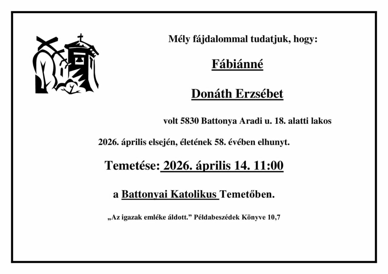 Április 14-én, kedden 11 órától kísérjük utolsó útjára a battonyai római katolikus temetőben.